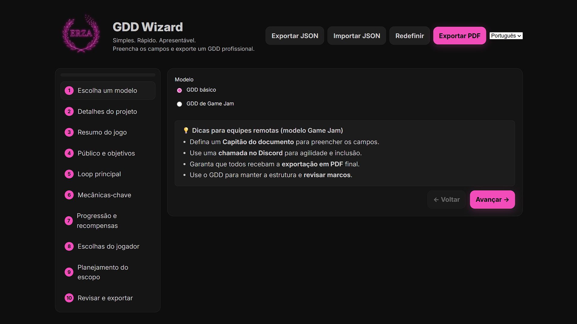 Estamos animados em anunciar que o GDD Wizard agora está disponível em Português (Brasil)! 🎉