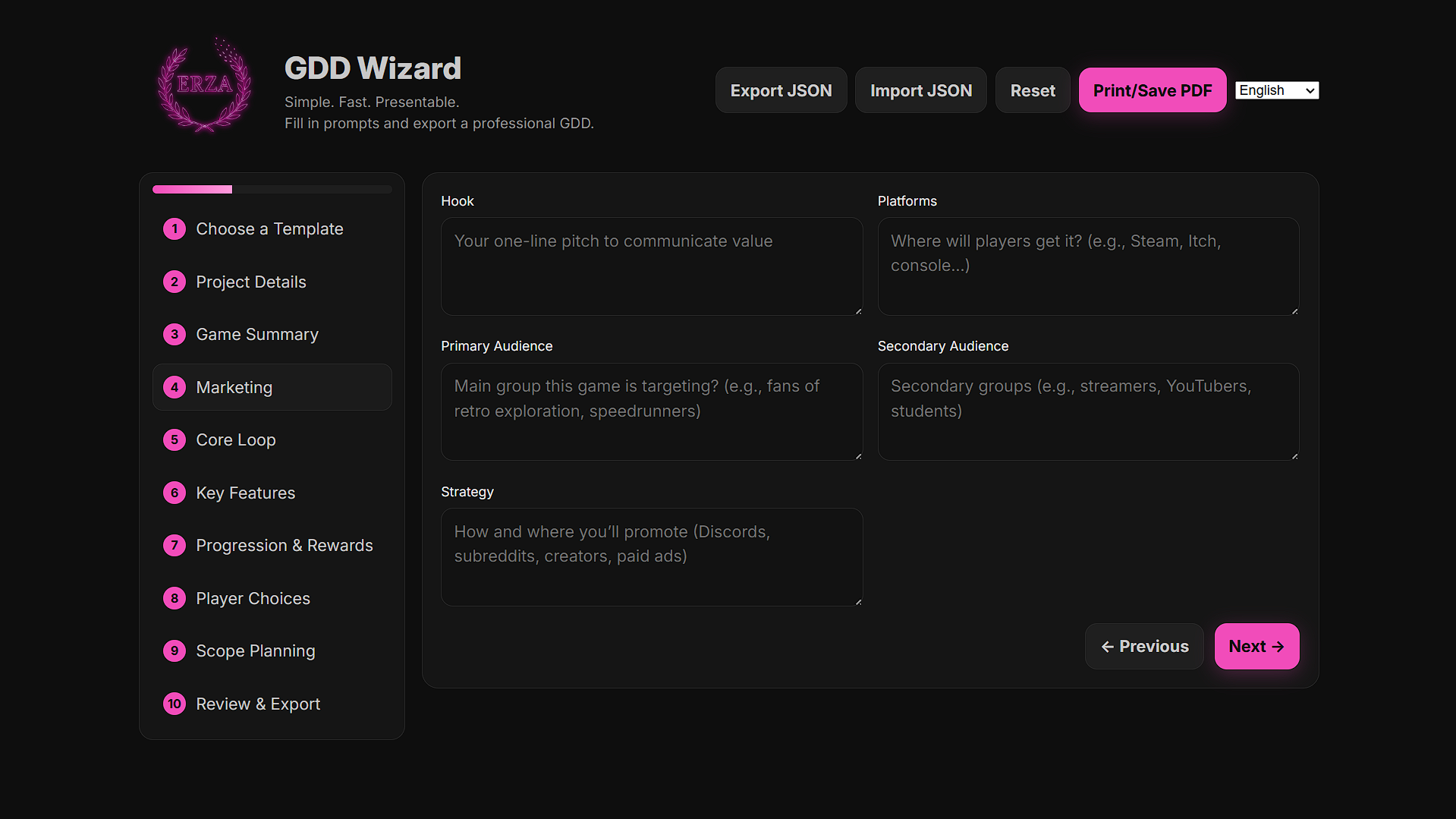 Today we've expanded GDD Wizard with a dedicated Marketing section after receiving some amazing feedback from a very kind user.
